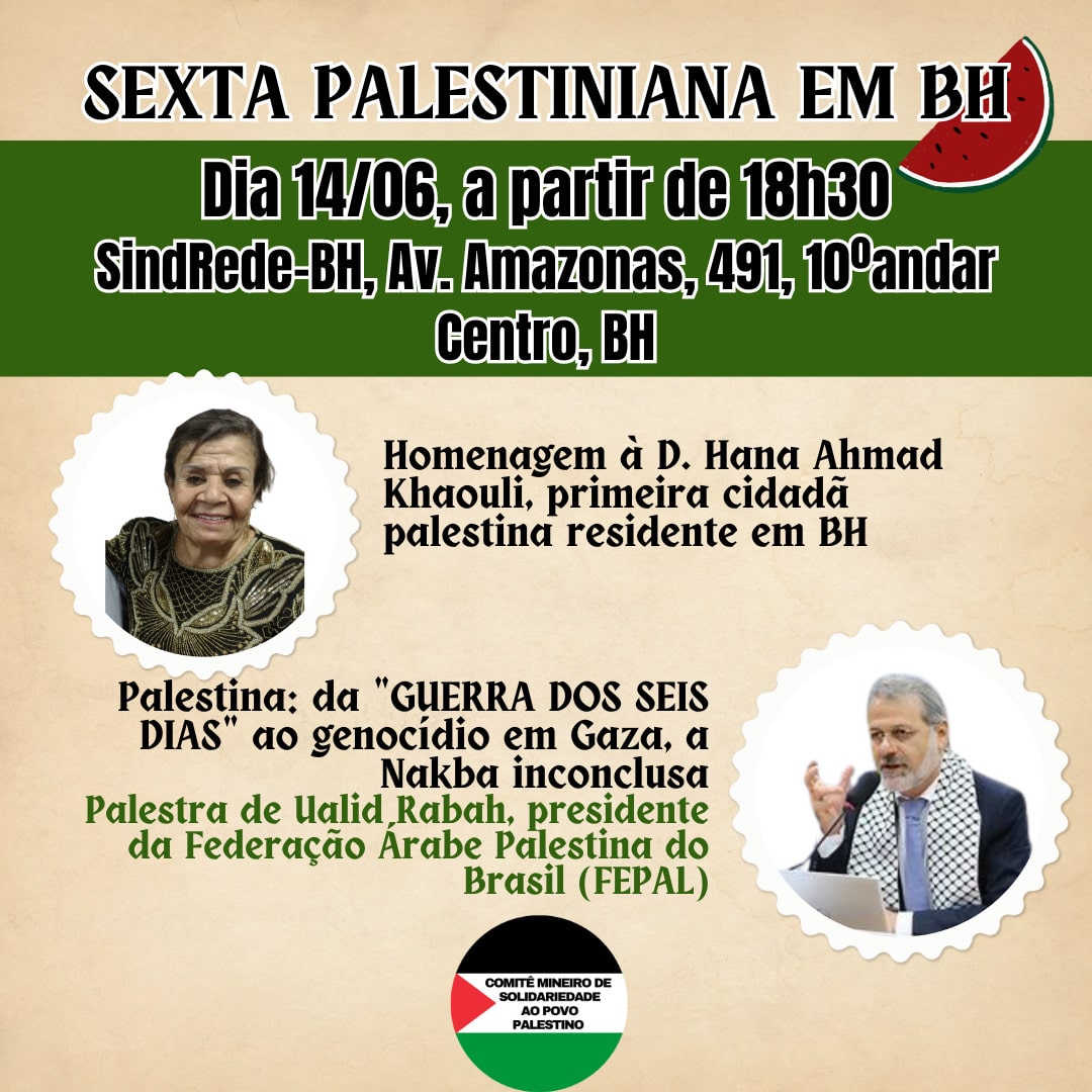 O Presidente Nacional da Federação Árabe-Palestina no Brasil (FEPAL) Ualid Rabah é o convidado da Sexta Palestiniana em BH que será realizada dia 14/06 a partir das 18h30 na Sede do Sind-REDE/BH. Ualid apresenta o tema “Palestina da ‘Guerra dos Seis Dias’ ao genocídio em Gaza, a Nakba inconclusa“
